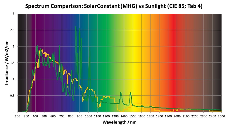 À l’heure actuelle, bien que les lampes au xénon à filtre optique correspondent le mieux au rayonnement solaire naturel dans la plage spectrale des UV et de la lumière visible, la technologie MHG présente deux avantages par rapport au xénon. Tout d’abord, les MHG sont des sources très efficientes et offrent plus de puissance pour une même quantité d’électricité utilisée. Ils sont mieux adaptés à l’éclairage de grandes surfaces. Deuxièmement, le MHG émet des quantités plus faibles de rayons infrarouges que le xénon, facilitant la gestion thermique. Comme avec le xénon, des filtres optiques permettent d’affiner le réglage de l’irradiance spectrale afin de fournir un rayonnement solaire en naturel ou à l’intérieur, sous verre.
