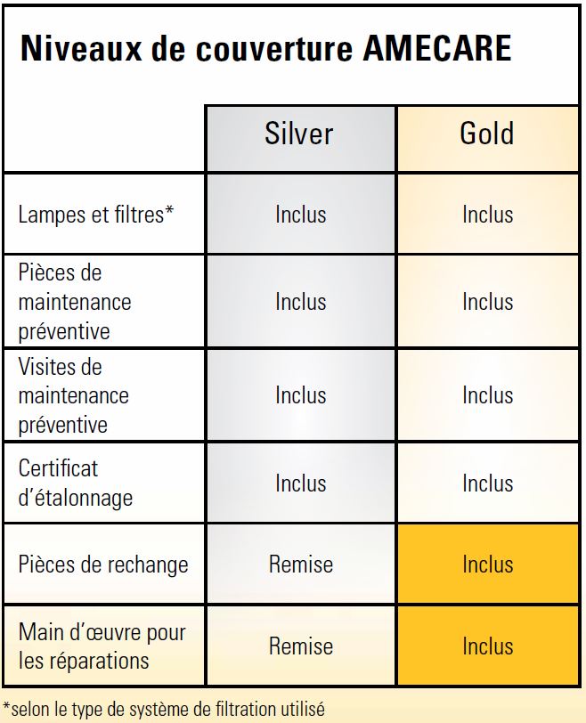 AMECARE Gold vous offre, pour tous les appareils actuels, l’ensemble des avantages du niveau Silver, ainsi que la réparation ou le remplacement de tout composant dont la défaillance est due à une usure normale. Le niveau Gold inclut également des visites de maintenance sur site supplémentaires selon les besoins (des frais de déplacement peuvent s’appliquer). Cette offre équivaut à une extension de garantie.