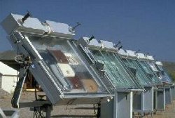 Un dispositif réfléchissant de concentration solaire à lentille de Fresnel. La lumière du soleil est concentrée sur des échantillons au moyen de 10 miroirs pour atteindre une intensité égale à celle de 8 soleils.